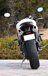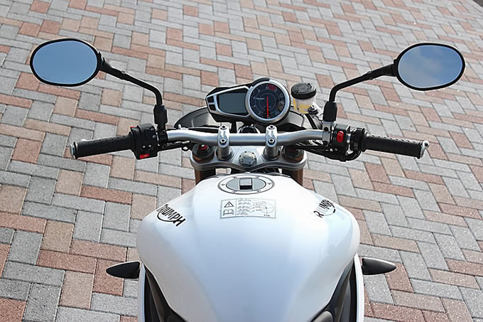 どこまでも一定にトルクが出続けてくれるような、並列3気筒独特のスーパーフラットな出力特性なのだが、1050ccトリプルが真の実力を発揮するのは 7,000rpm から。トルクの波にうまく乗せると、なんと2速からでもパワーリフトが可能! これはリッタークラスのスーパースポーツでもなかなか出来ない芸当だ。?ハンドリングは軽快さの中にもしっとりとした安定感があり、コーナリングがとても楽しい。シャーシがコンパクトになり、ホイールが軽くなったためか、特にバネ下が軽い感じで、切り返しの俊敏さなどはとてもオーバーリッタークラスとは思えないほど。ネイキッドというよりはスーパースポーツのそれに近い感じだ。直立からフルバンク付近まで非常に素直で、コーナーではフロントを中心に一定の接地感を保ったまま綺麗にラインを描いてくれる。従来モデルは倒し込みと同時にフロントが切れ込み、立ちが強くなる傾向があったが、そうしたクセはきれいに解消されている。新型ではエンジン搭載位置を前方に移動し、スイングアーム長を伸ばすなど、まるでスーパースポーツと同じ設計思想で車体のディメンションをリニュアルしている。この走りっぷりも、そう聞けばさもありなん、といったところだ。