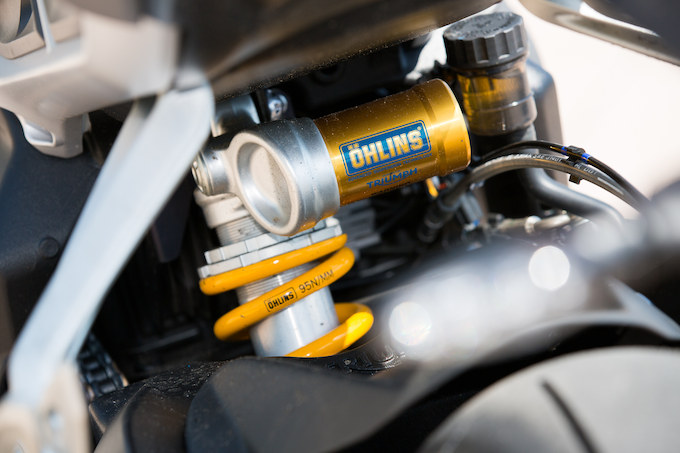 足回りも充実し、「RS」の前後サスペンションにはショーワ製のφ41mmビッグピストン倒立フロントフォークと、別体式リザーバータンク付きのオーリンズ製STX40モノショックを装備。ブレーキシステムも前後ブレンボ製で、特にフロントはM50ラジアルモノブロックキャリパー、およびレシオ可変タイプのラジアルマスターシリンダーを採用。OEタイヤにピレリ製ディアブロスーパーコルサSPを標準装着するなど、まさにスーパーバイク並みのハイスペック装備を誇る。