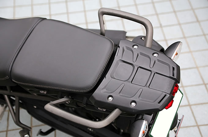 リアキャリアが標準装備されているのもツーリングライダーにはうれしい。大きさは、縦/約220mm、横/約230mm。リアシートとフラットにつながっているのも積載のしやすさに貢献。タンデムでなければ、サイドケースを付けなくても、キャリアとリアシートのスペースでキャンプ道具一式も楽々積めそうだ。