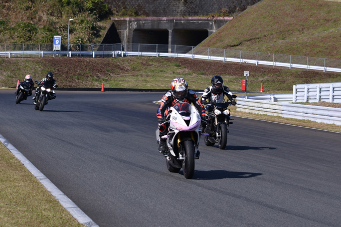 朝8時からはじまった受付のあと、まずは座学からスタート。サーキット走行基本から、コースの説明、注意点などについての説明が行われた。その後、パドックでライディングポジションについての講習が行われ、コーナリングの基本として「加速」「準備」「ブレーキング」「シフトダウン」「ステップイン」という5段階アプローチについての実践行い、サーキット初心者と経験者にチームを分けてショートコースでの慣熟走行が行われた。それから講師の先導付きで本コースを使っての20分の体験走行を2セット行い午前は終了。ランチのあとはショートコースに戻り20分の走行を3セット行うという充実したメニューであった。