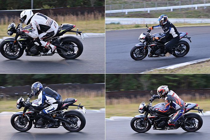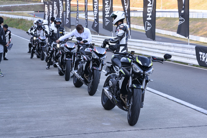 今回のTRAは新型ストリートトリプルRSのメディア試乗会との同時開催となっていたので、その締めくくりとしてショートコースで15分の新型ストリートトリプルRSの試乗を行い、その進化に参加者は驚きを隠せない様子であった。