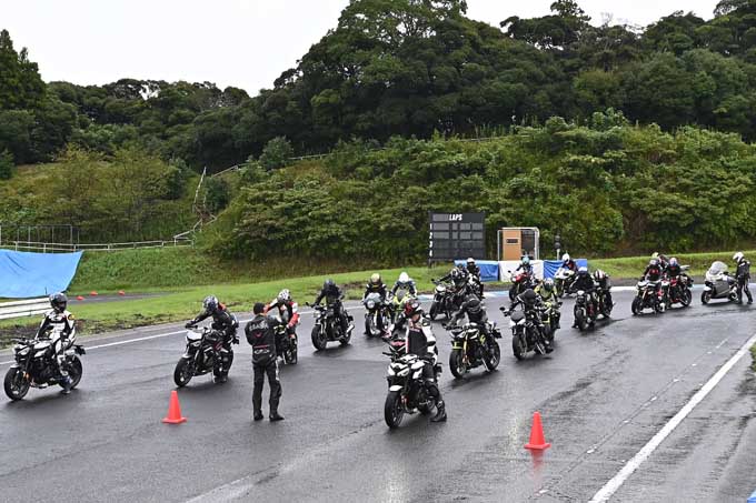 朝8時から受付がスタートし、茂原ツインサーキットのレストランで9時からブリーフィング開始。講師陣の紹介から、サーキット走行の基礎知識、雨の日だからこそ重要な丁寧な操作について、加えてライン取りなどの講習が行われた。それからパドックでライディングポジションの確認、コーナリングの5段階アプローチについてのレクチャーが行われ、メインストレートでコーナーアプローチを実践し、午前中はここまで。昼食後、20分間のコース走行を3本行い、16時に終了となった。