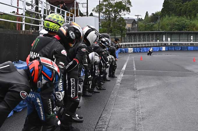 ノア講師からはコースイン、ピットインの注意点、特に雨の日は前を走るライダーには近づき過ぎず、適度な距離をおくことが安全走行には重要だと語られた。